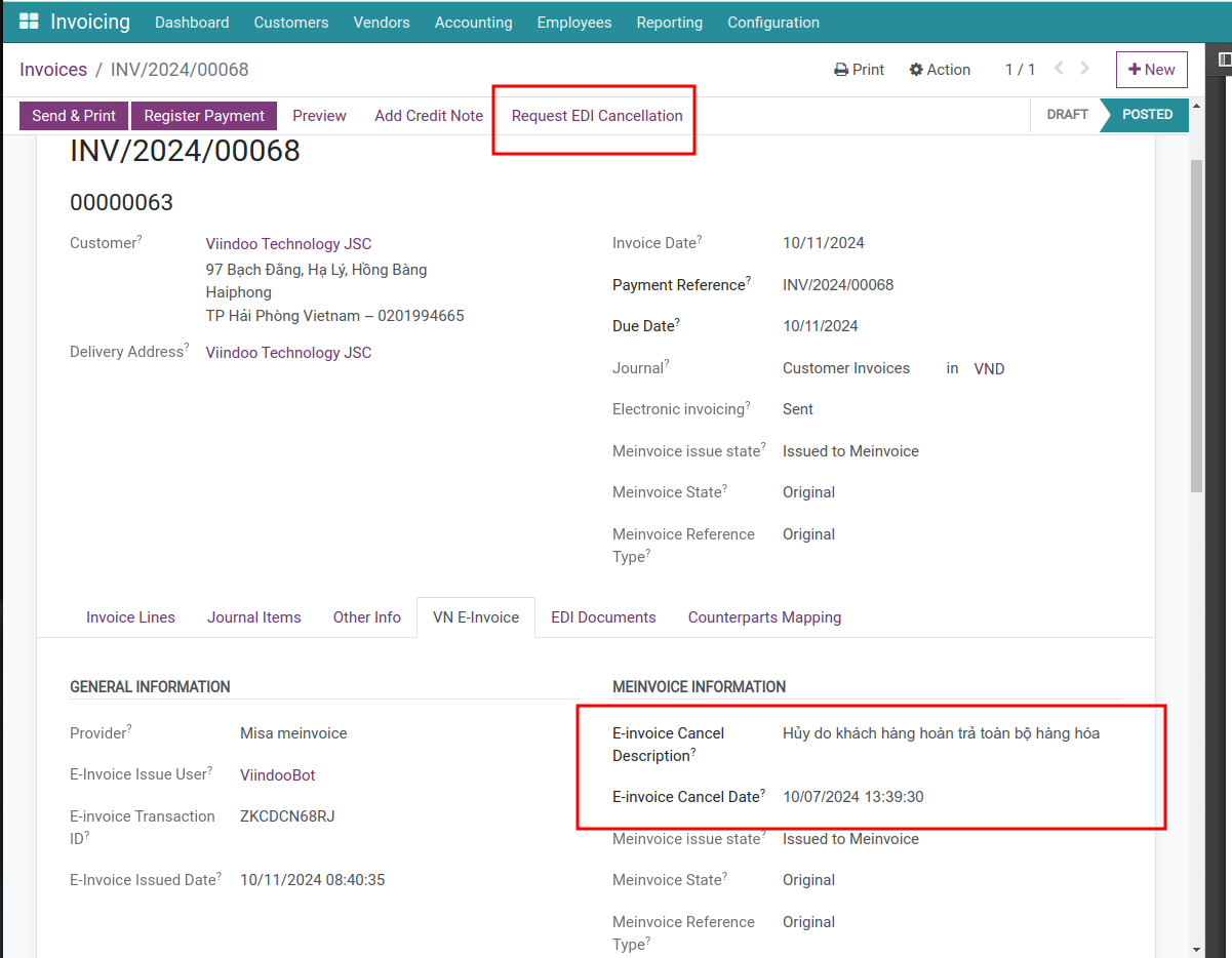 - Quản lý quy trình: Thực hiện các tác vụ phát hành đơn, phi hóa đơn hoặc xuất hóa đơn thay thế/điều chỉnh trực tiếp trên giao diện Odoo và đồng bộ trạng thái từ cơ quan Thuế về hệ thống.